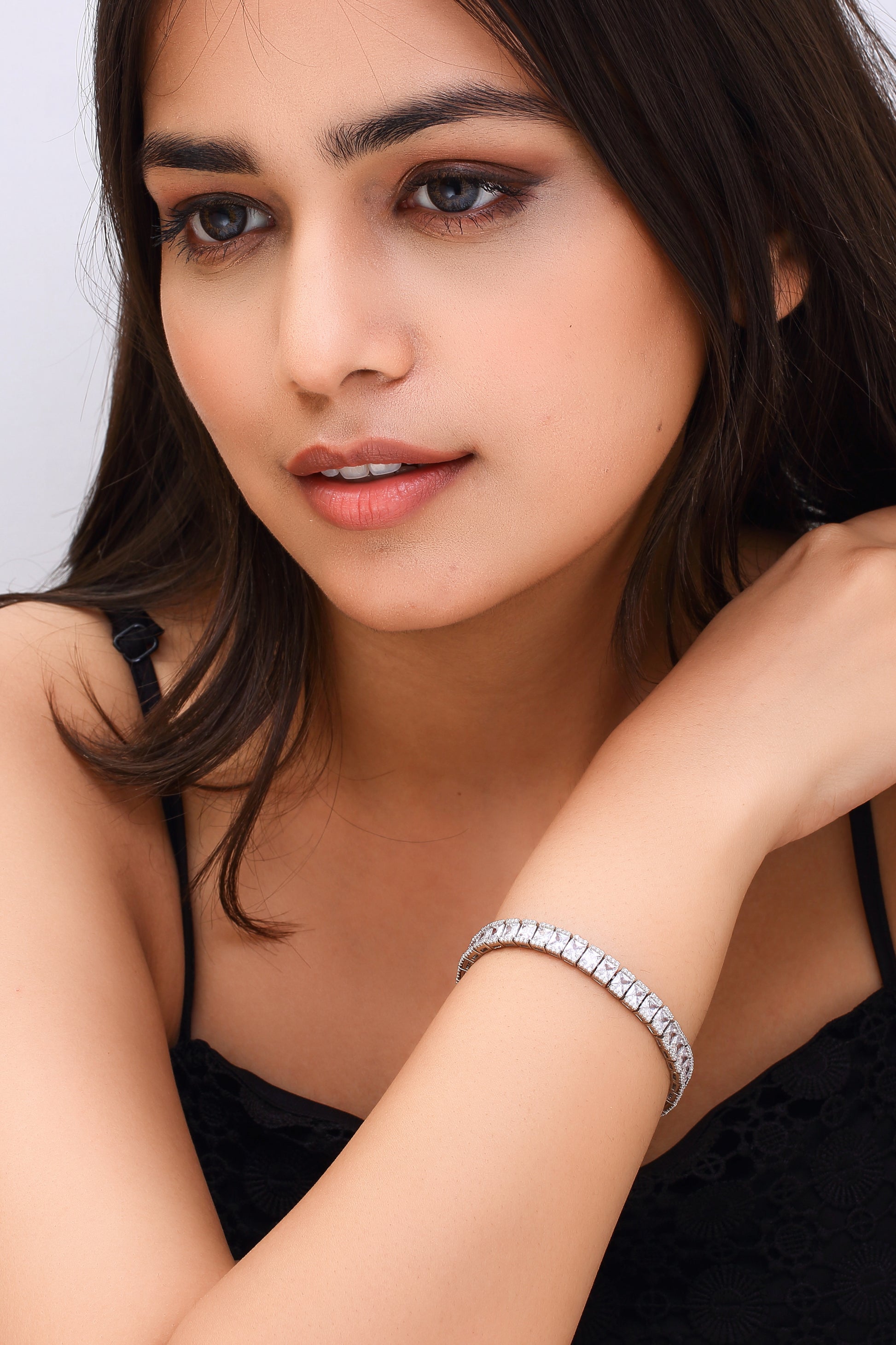 The Gleaming Squares Tennis Bracelet features a continuous line of perfectly cut square diamonds, set in a sleek and polished band, offering a sophisticated and timeless look.