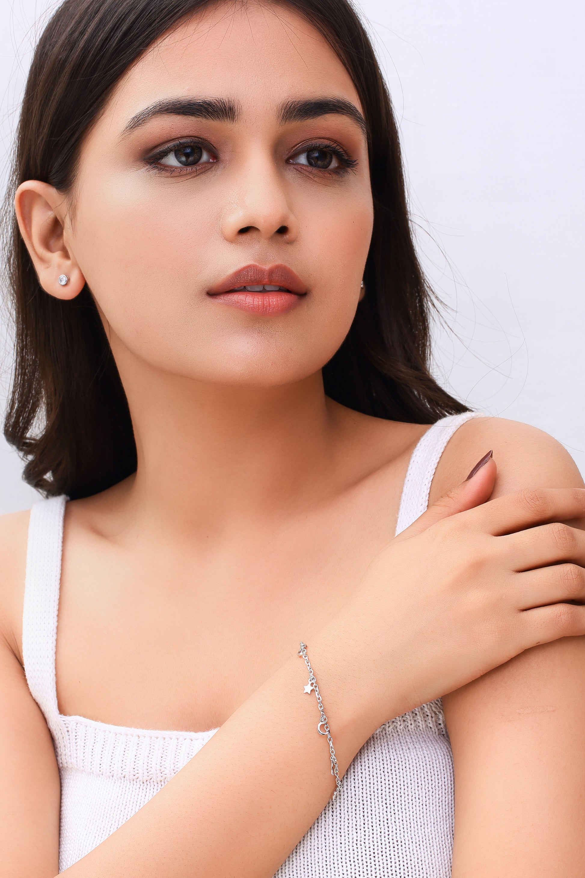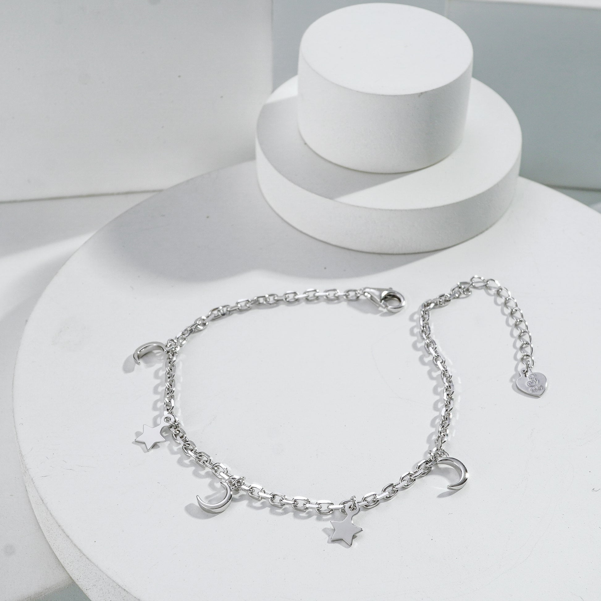 The Celestial Charms Bracelet features delicate crescent moons and star charms, elegantly suspended from a fine silver chain. This bracelet captures the enchanting beauty of the night sky, adding a touch of celestial elegance to any look.