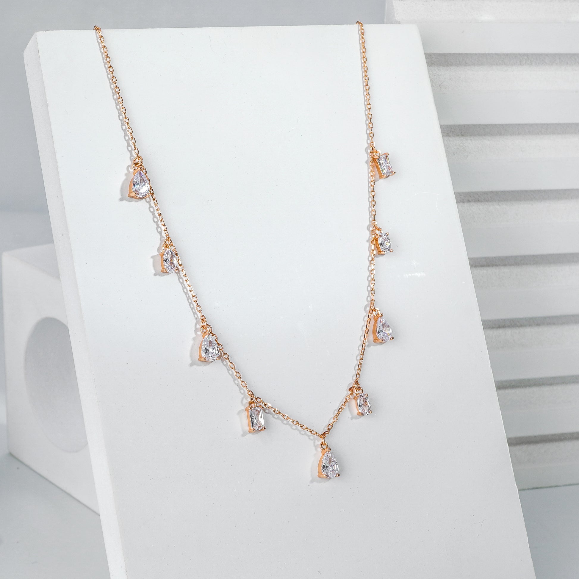 This Princess Necklace features shimmering crystals delicately hanging from a rose gold chain, adding a touch of regal elegance to any outfit.