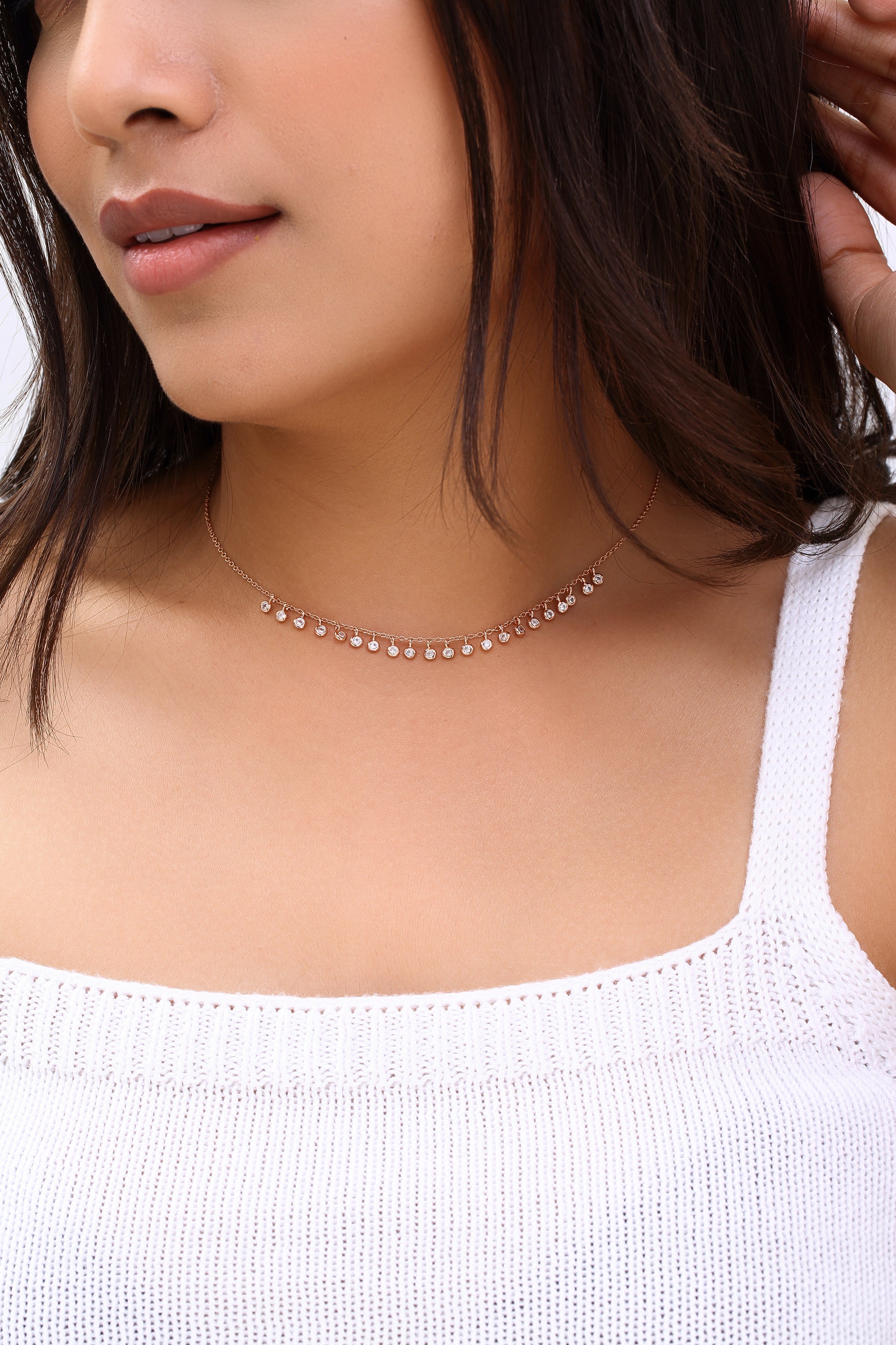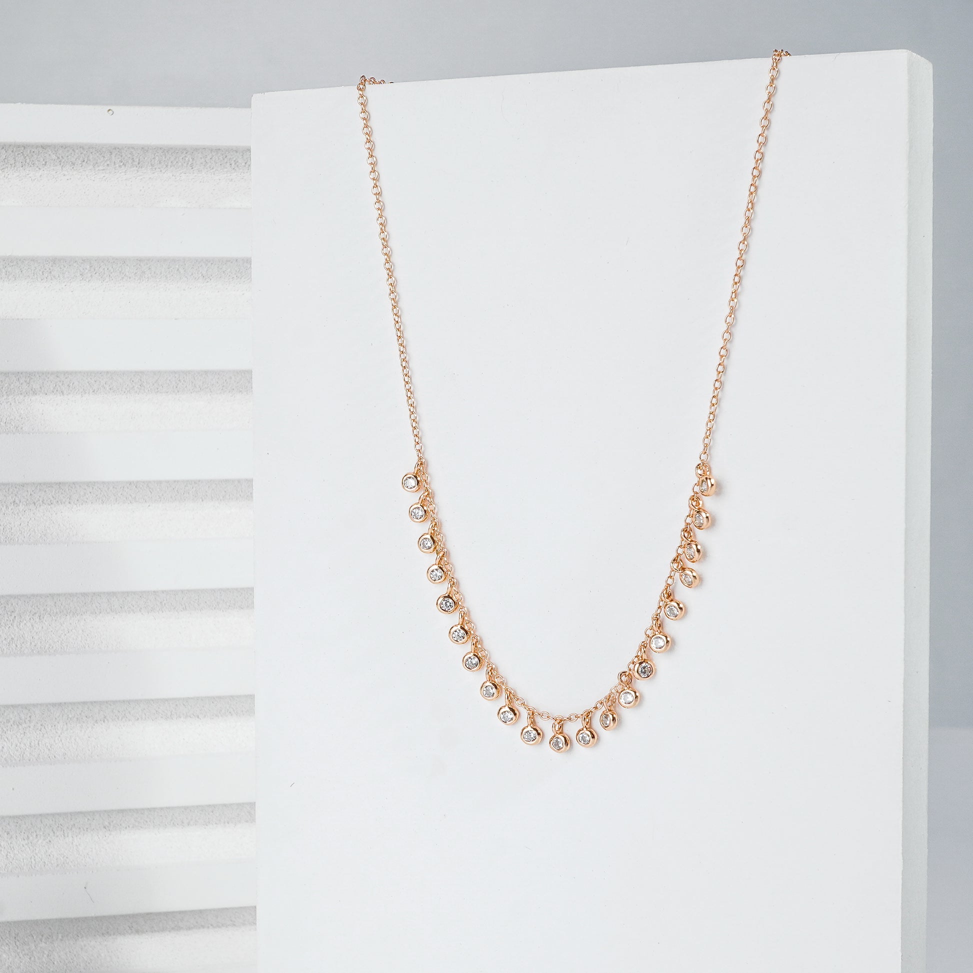 The Dazzling Drops Necklace features a series of delicate, gold-hued drops, each adorned with a shimmering stone, creating a refined and captivating look.