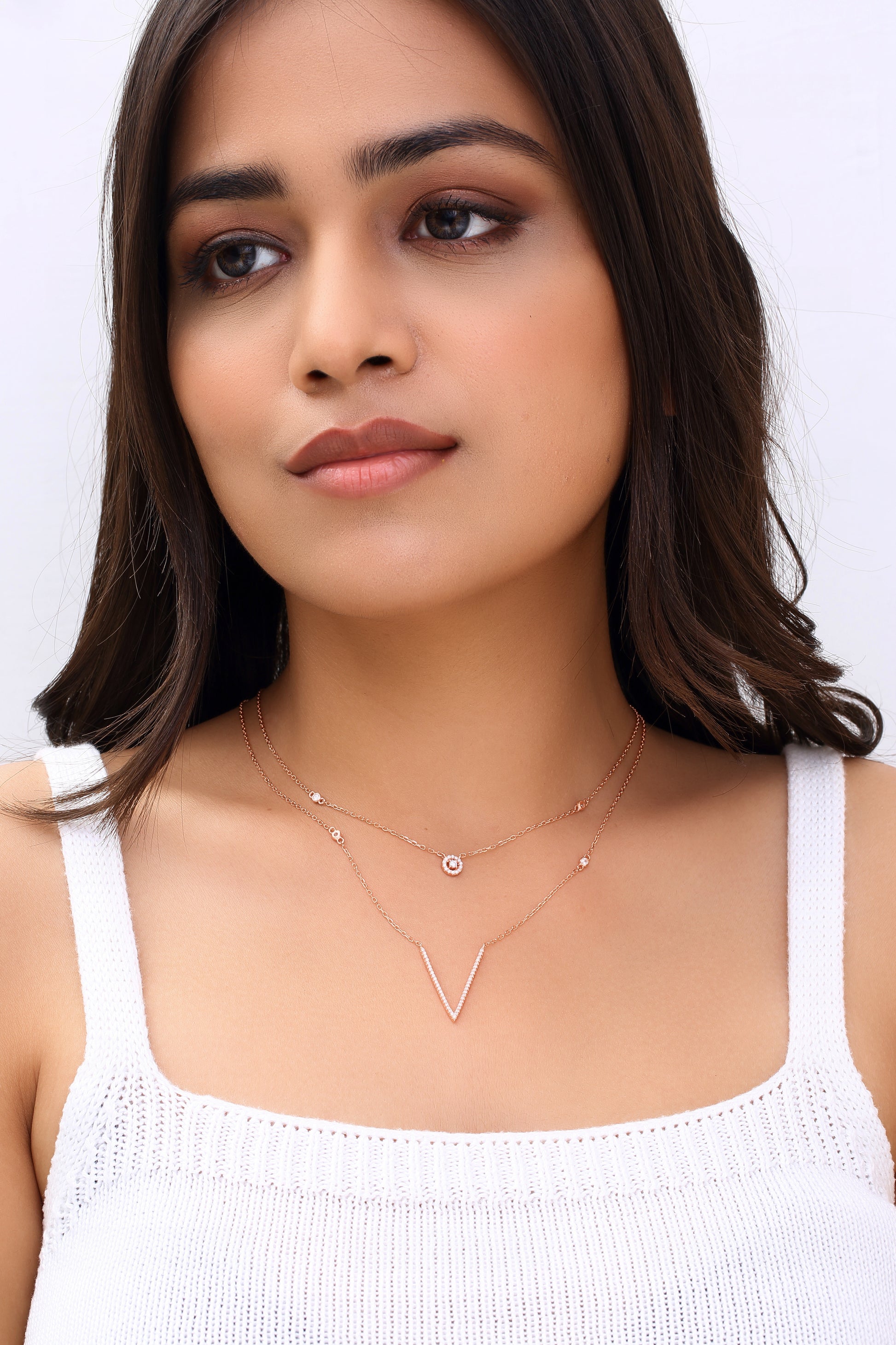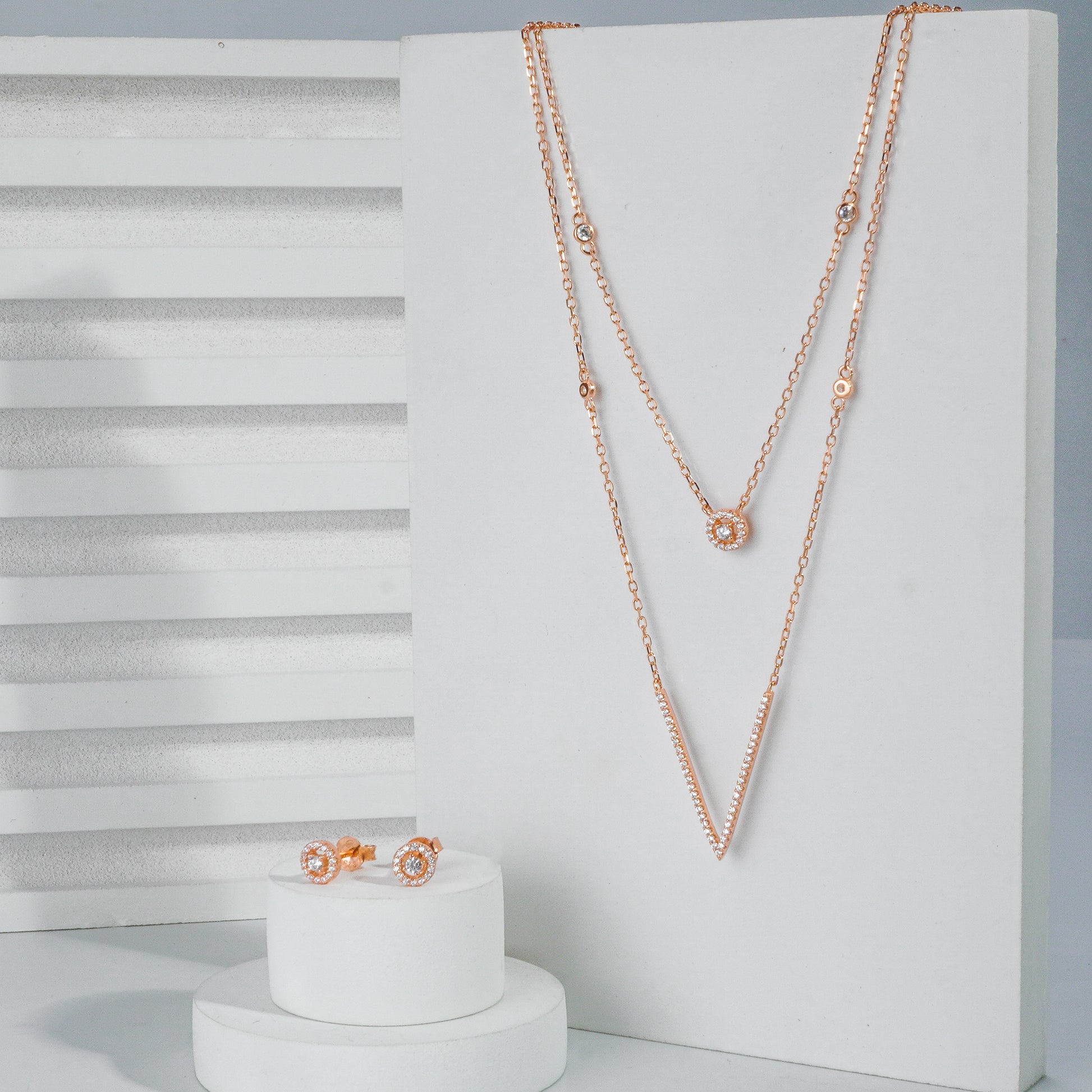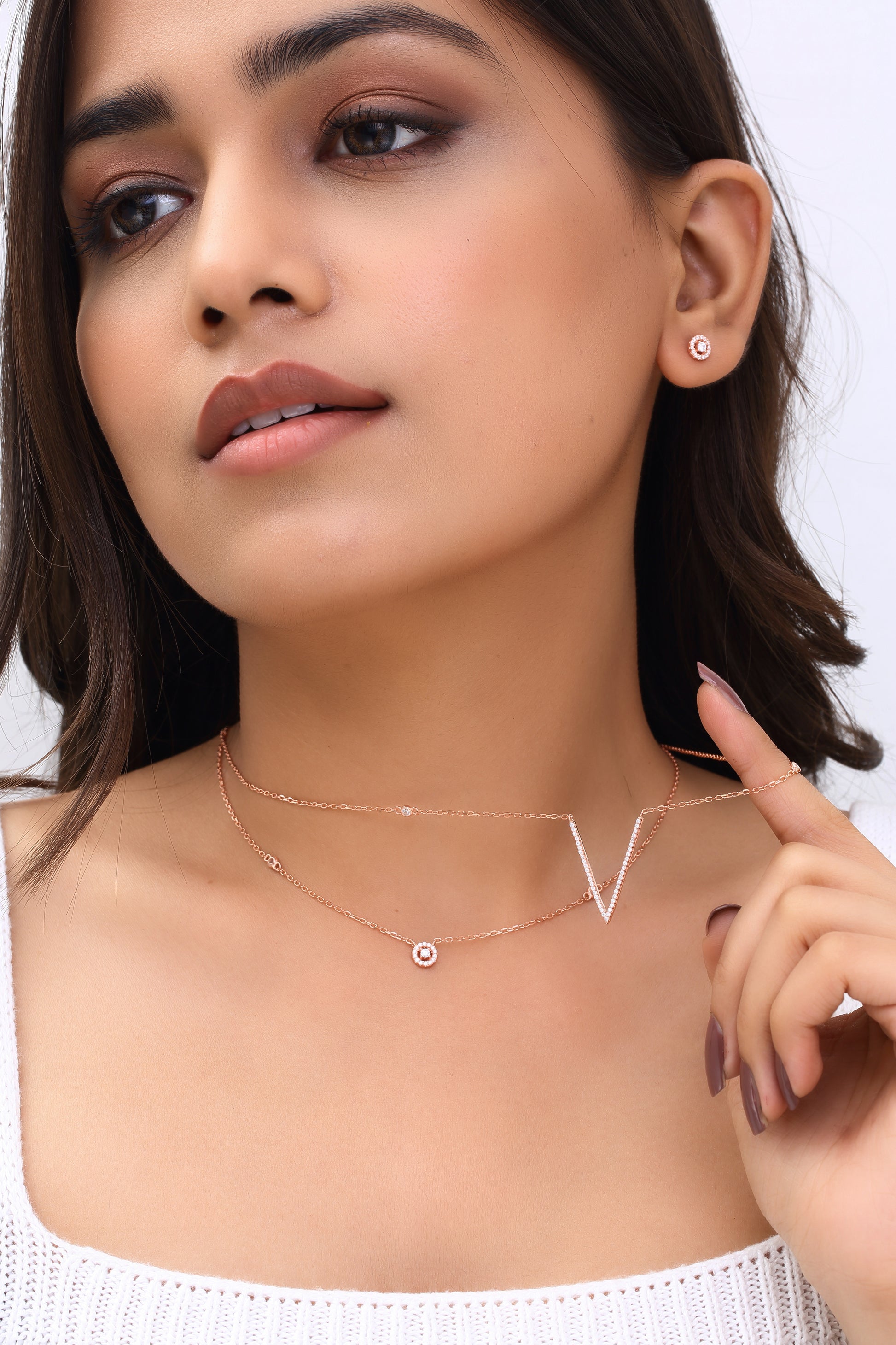 The Dual Halo Set features two layered chains and matching earrings, each with circular accents, creating a harmonious and elegant look.