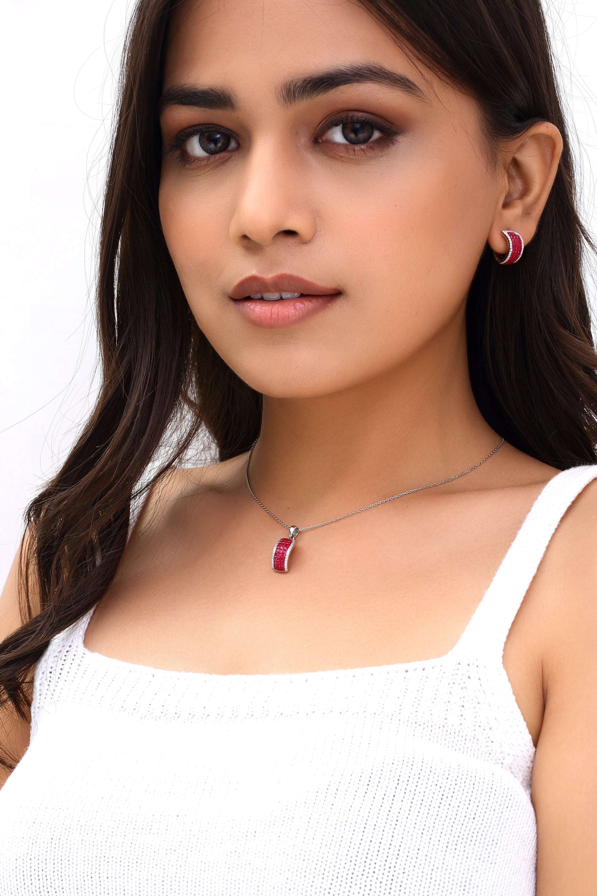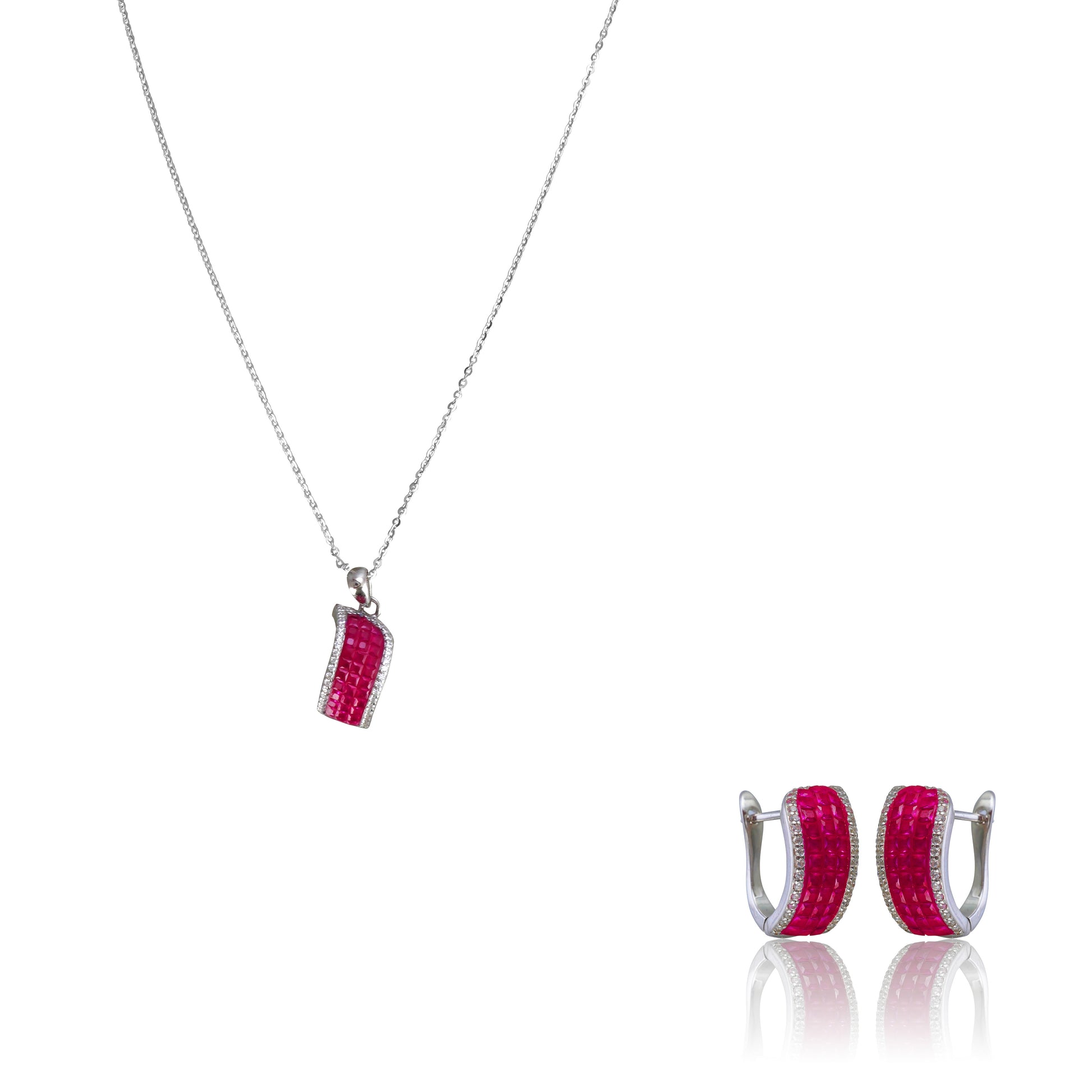 The Scarlet Wave Chain Set features a bold red pendant and matching earrings, each showcasing a sleek wave design that adds a touch of modern elegance to your look.