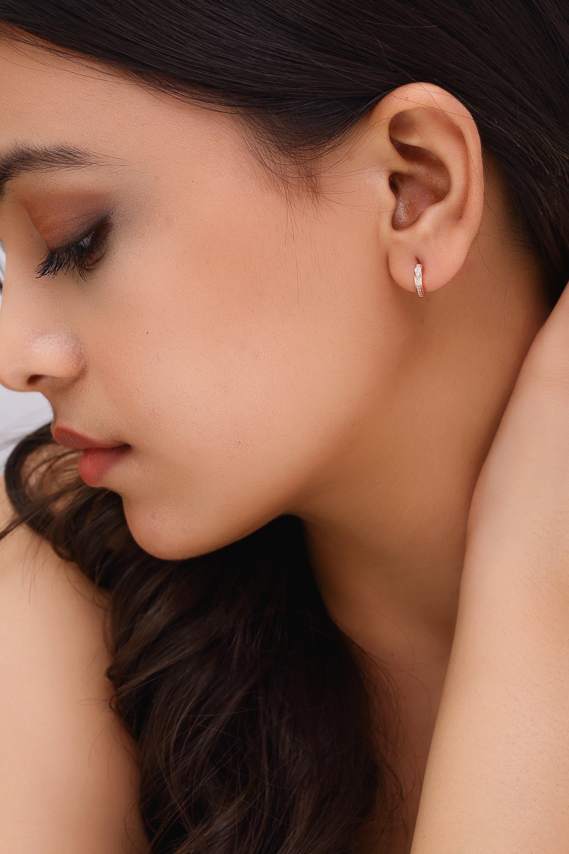 The Aurora Heart Hoops, designed with a distinctive heart-shaped curve and set with shimmering stones. These earrings bring a modern twist to a classic shape, making them a versatile addition to your collection
