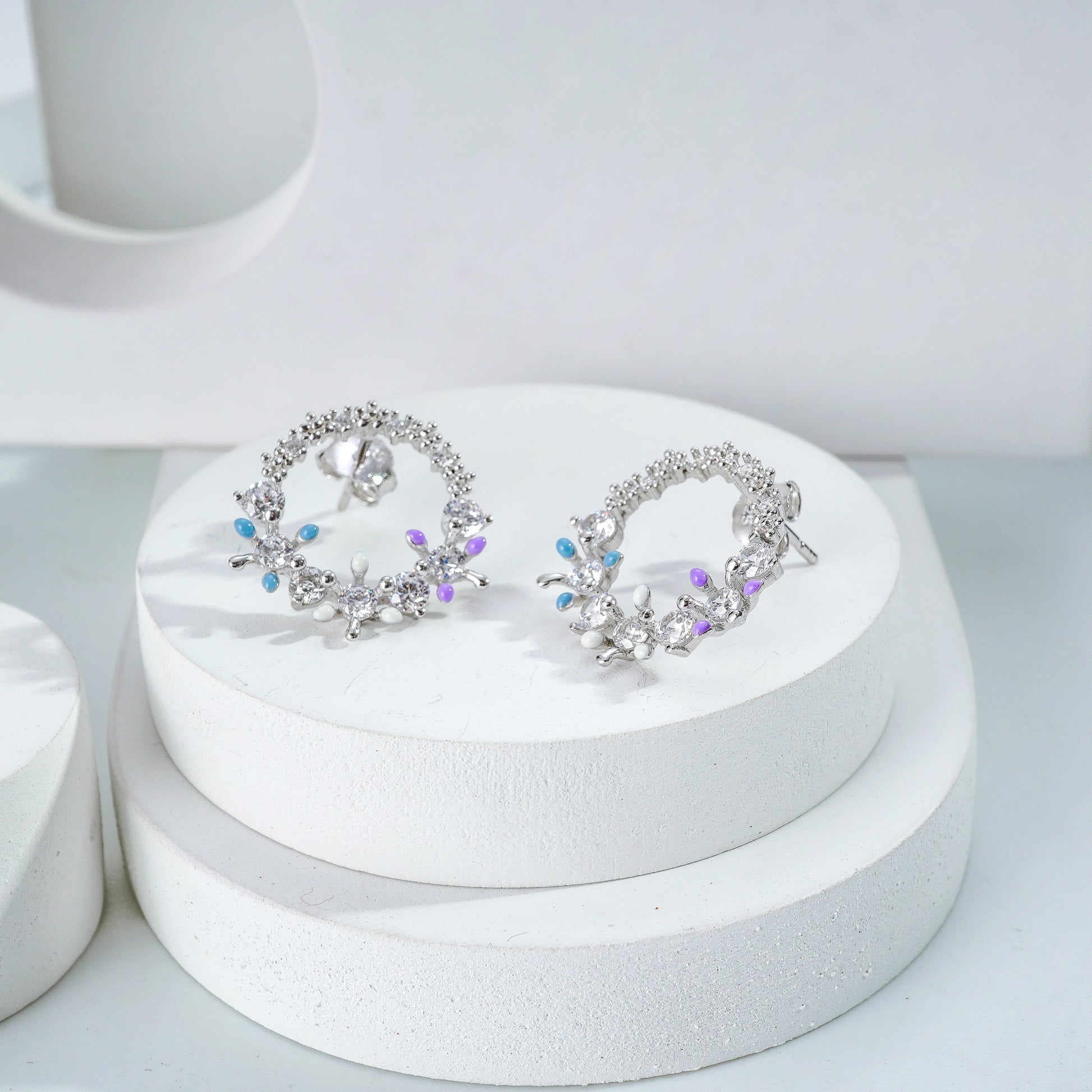 The Celestial Bloom Hoops, adorned with delicate floral accents and shimmering stones set in a radiant hoop design. These earrings bring a touch of whimsy and light to your style