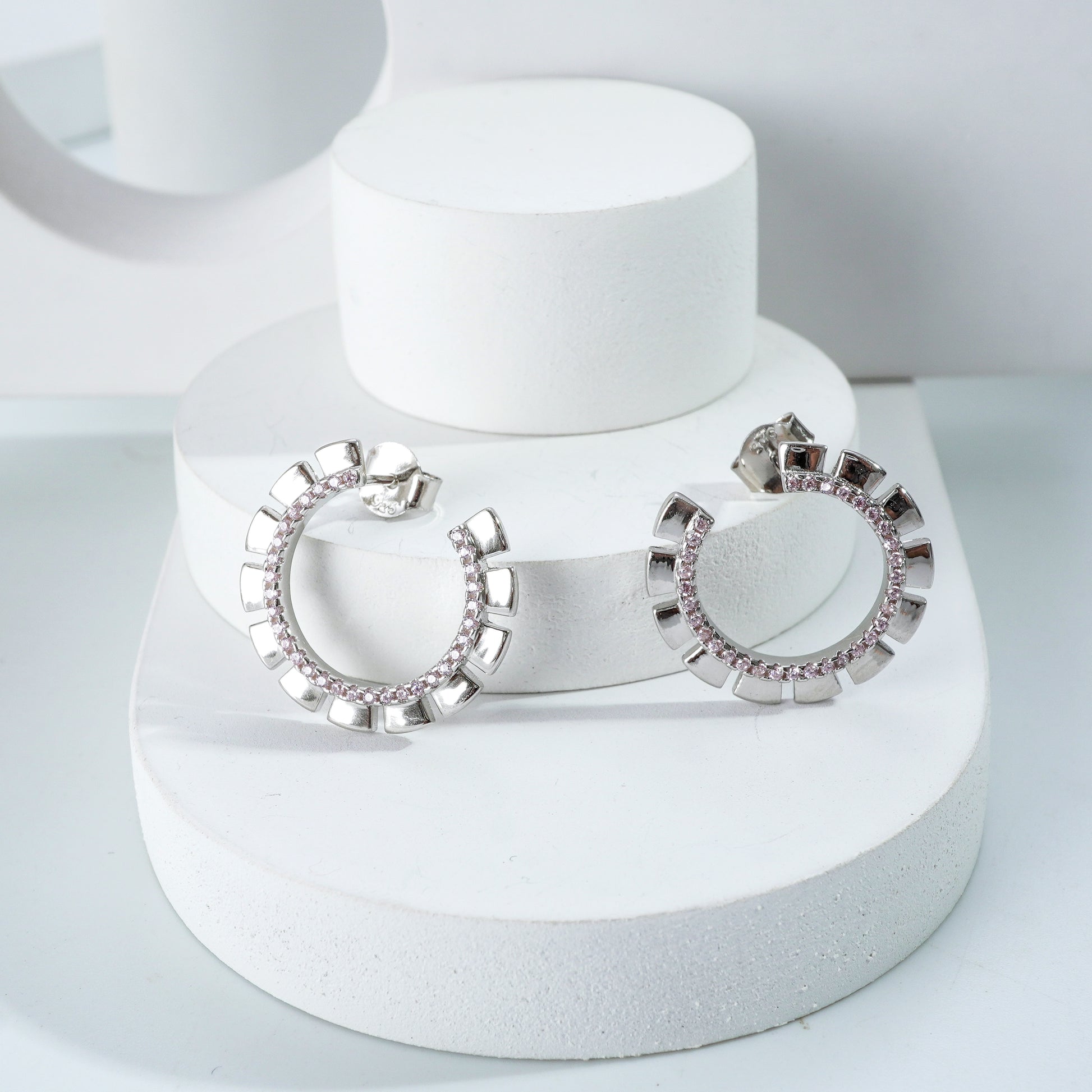 Expertly designed with a distinct cutout pattern, the Faceted Arc Earrings feature carefully positioned shimmering zirconia accents. This creates a captivating blend of light and geometry.