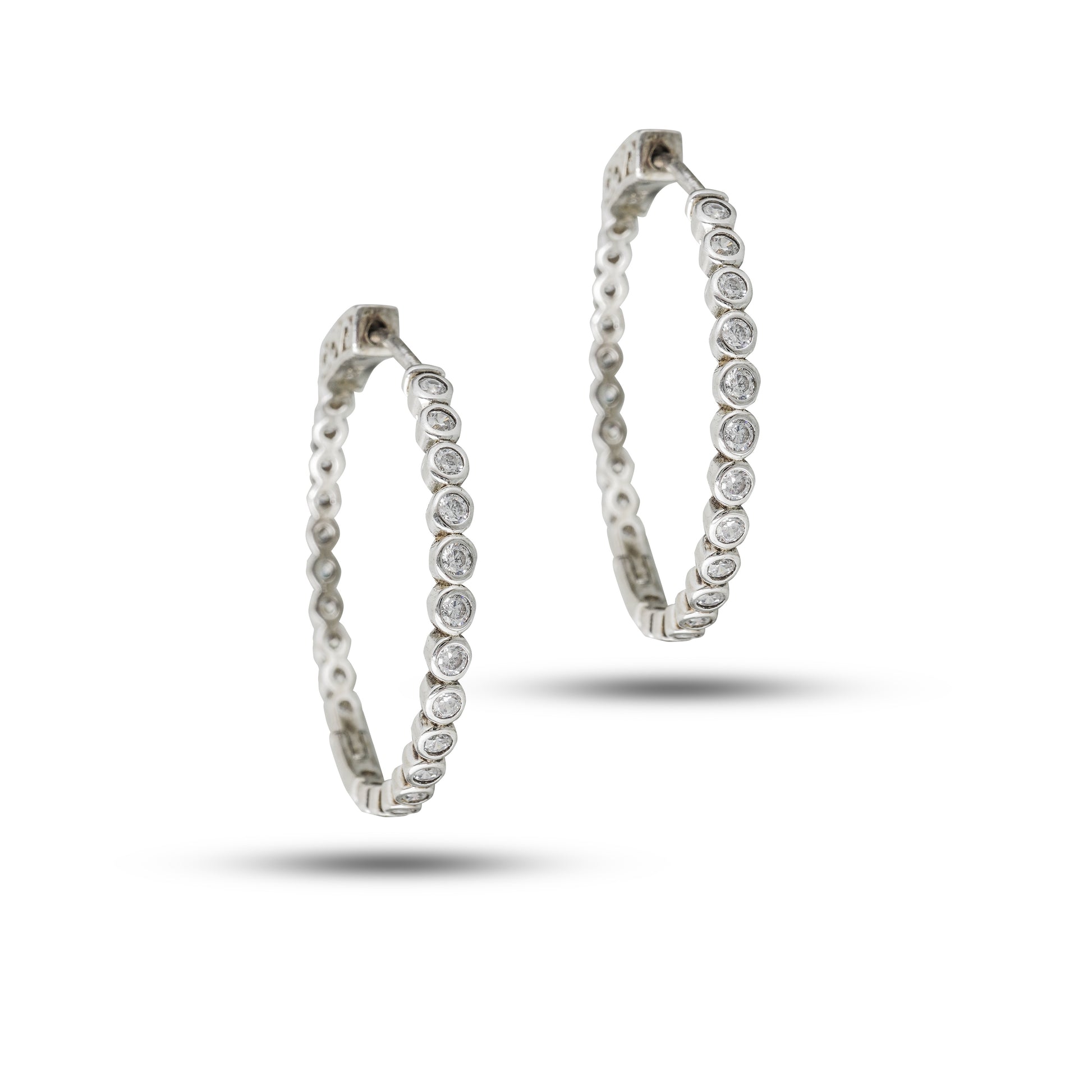 The Silver Bezel-Set Hoop Earrings showcase a seamless row of sparkling zirconia stones nestled in sterling silver, making them adaptable for any occasion.