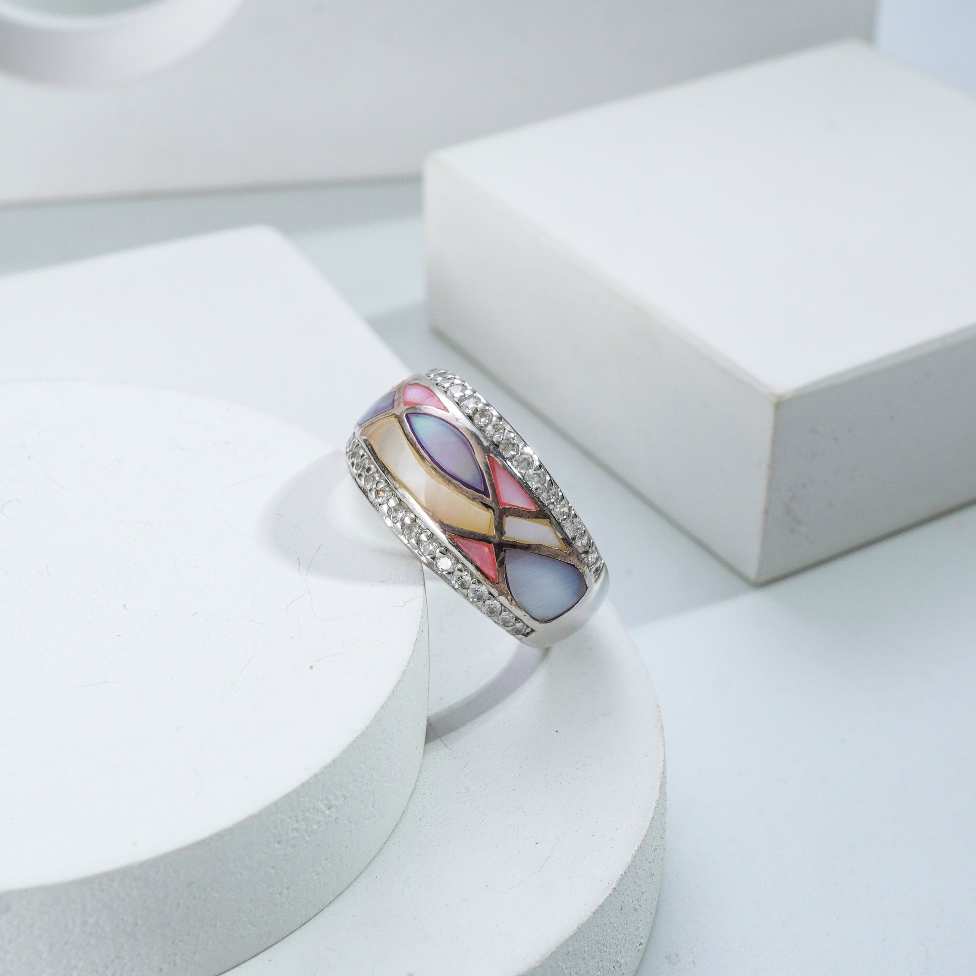 The Mosaic Gleam Ring features an intricate inlay of vibrant hues, framed by a band of sparkling stones. With its bold design and artistic composition, this piece adds a touch of modern artistry to your look.