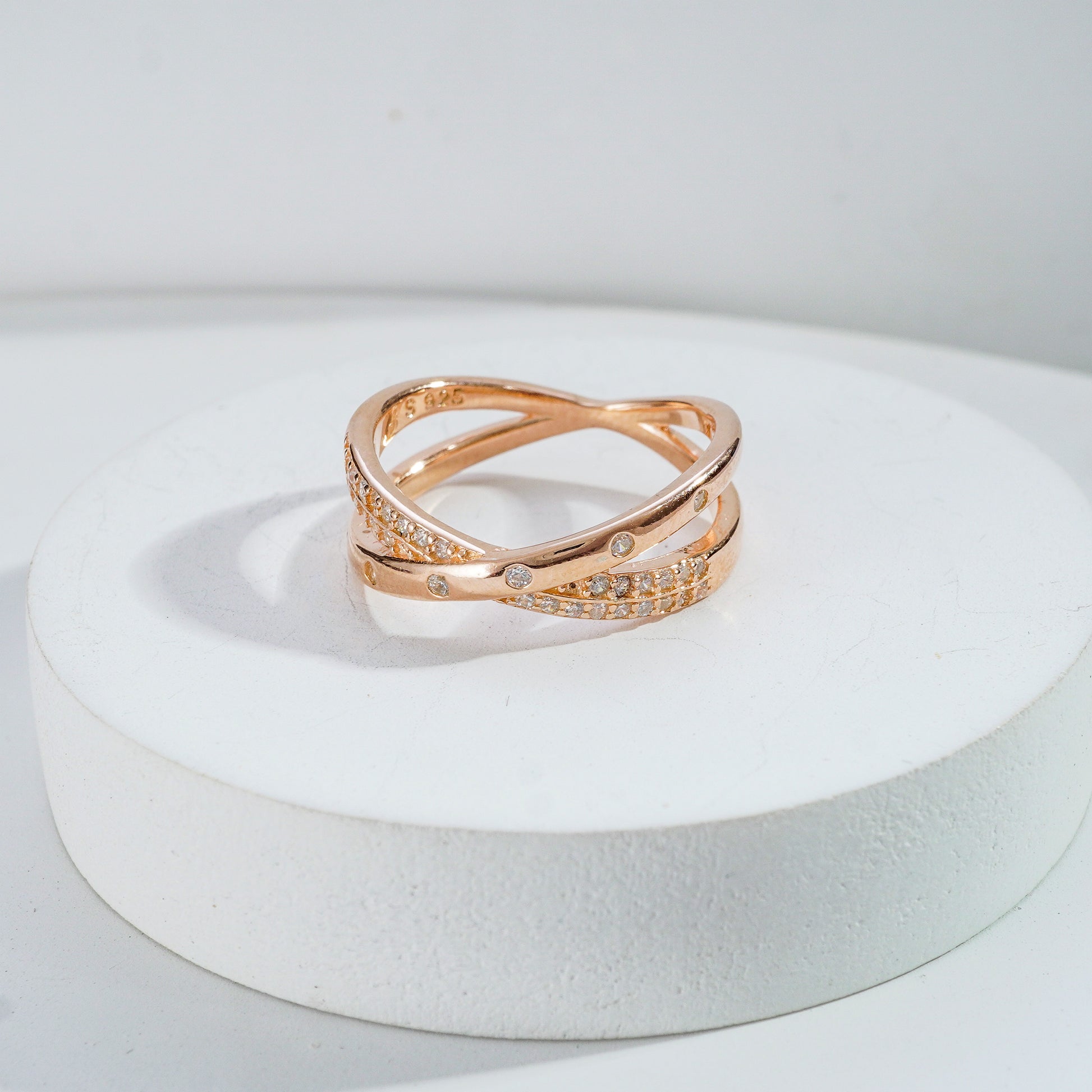 The Eternal Embrace Ring features interwoven bands adorned with sparkling zirconia stones, creating a sophisticated design that feels like an embrace, symbolizing unity and elegance.