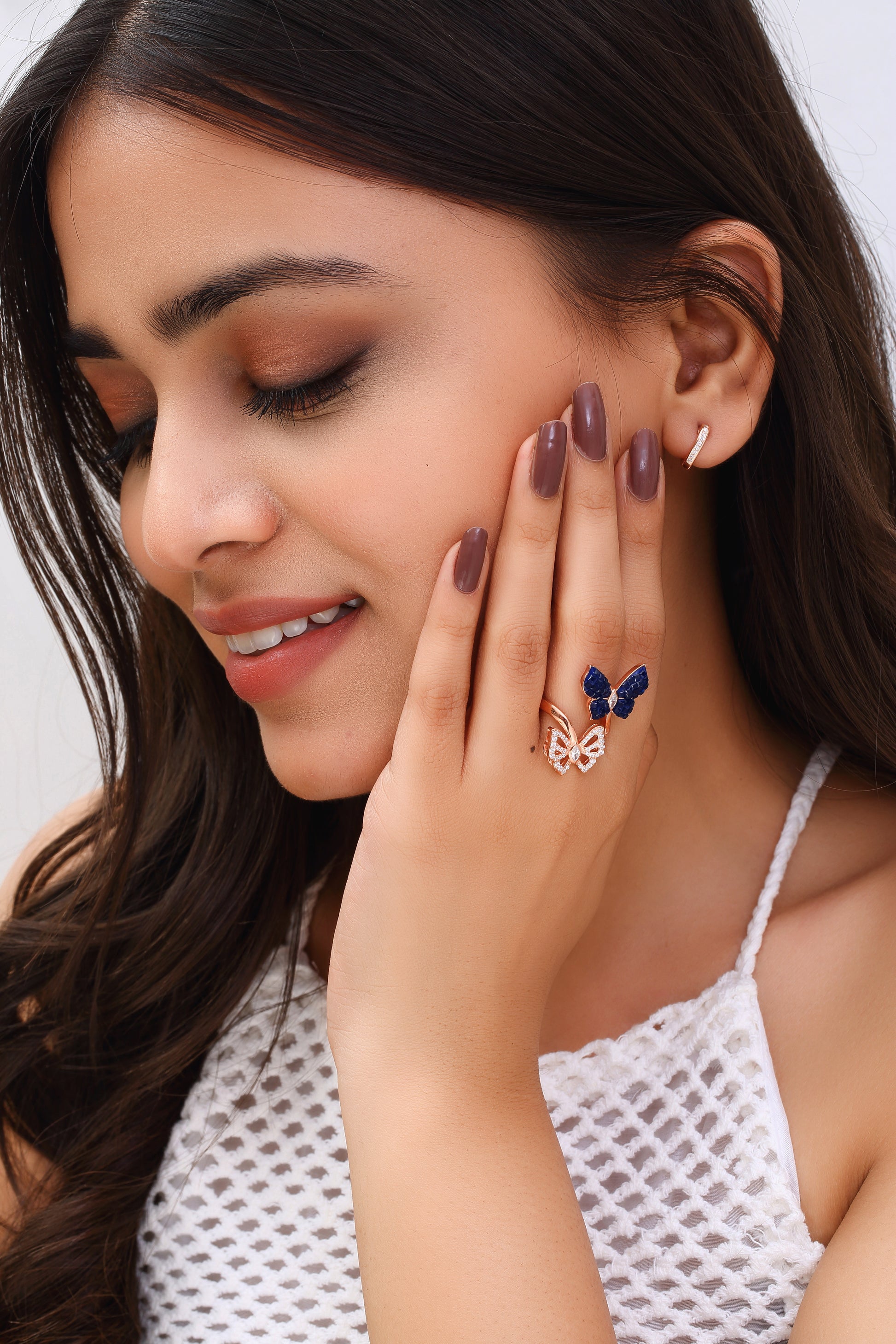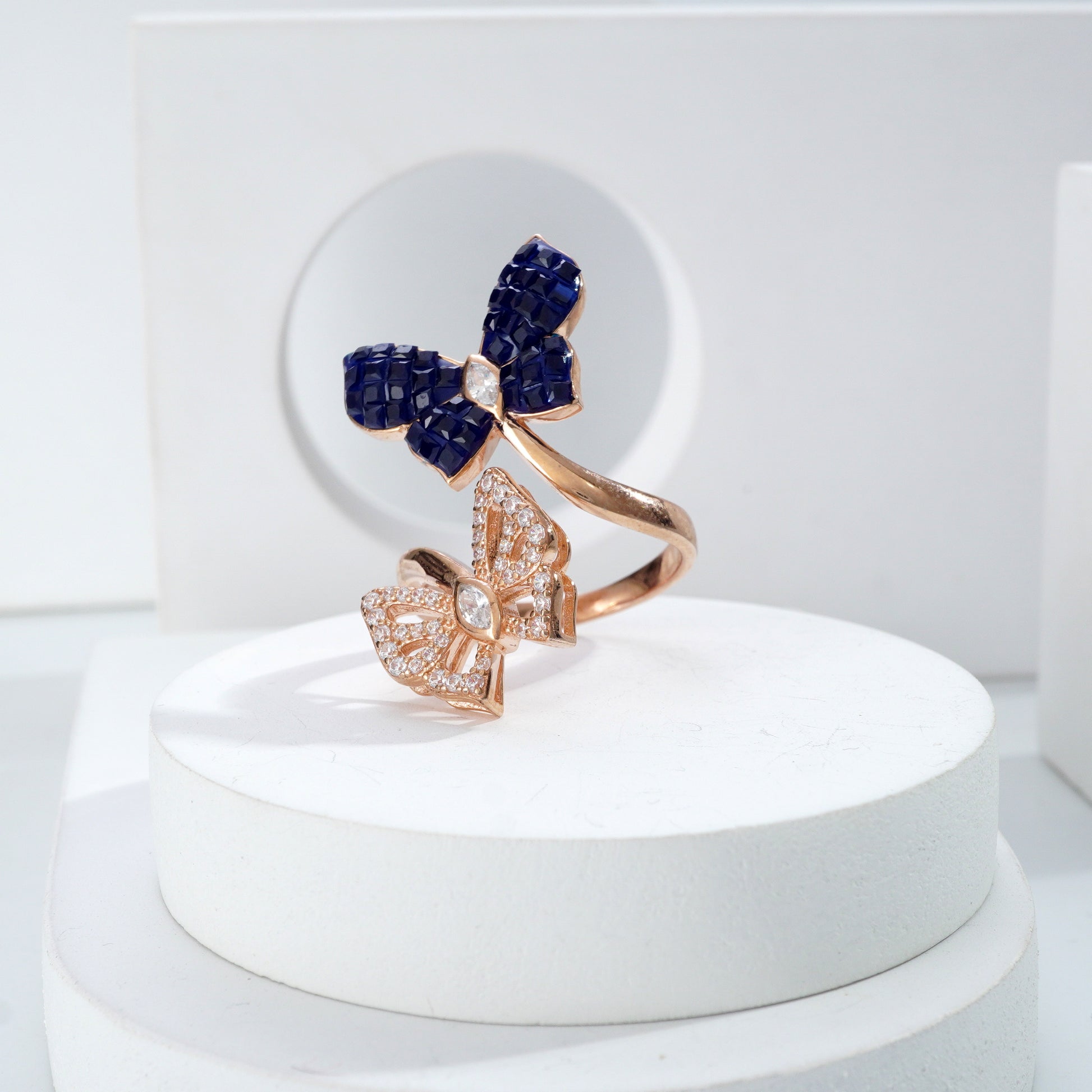 The Midnight Flutter ring features dual butterfly motifs, one adorned with deep blue sapphires and the other with delicate zirconia stones, set on a sleek gold band.