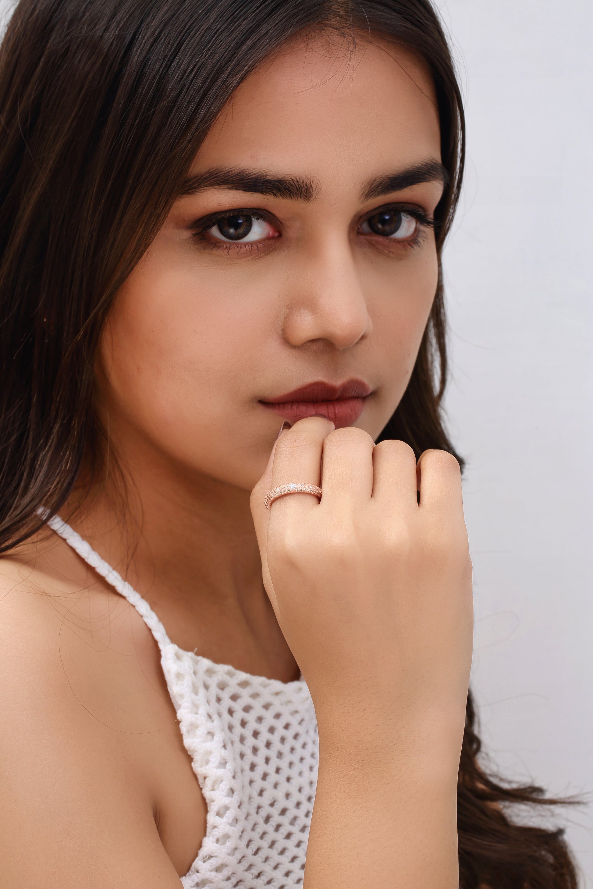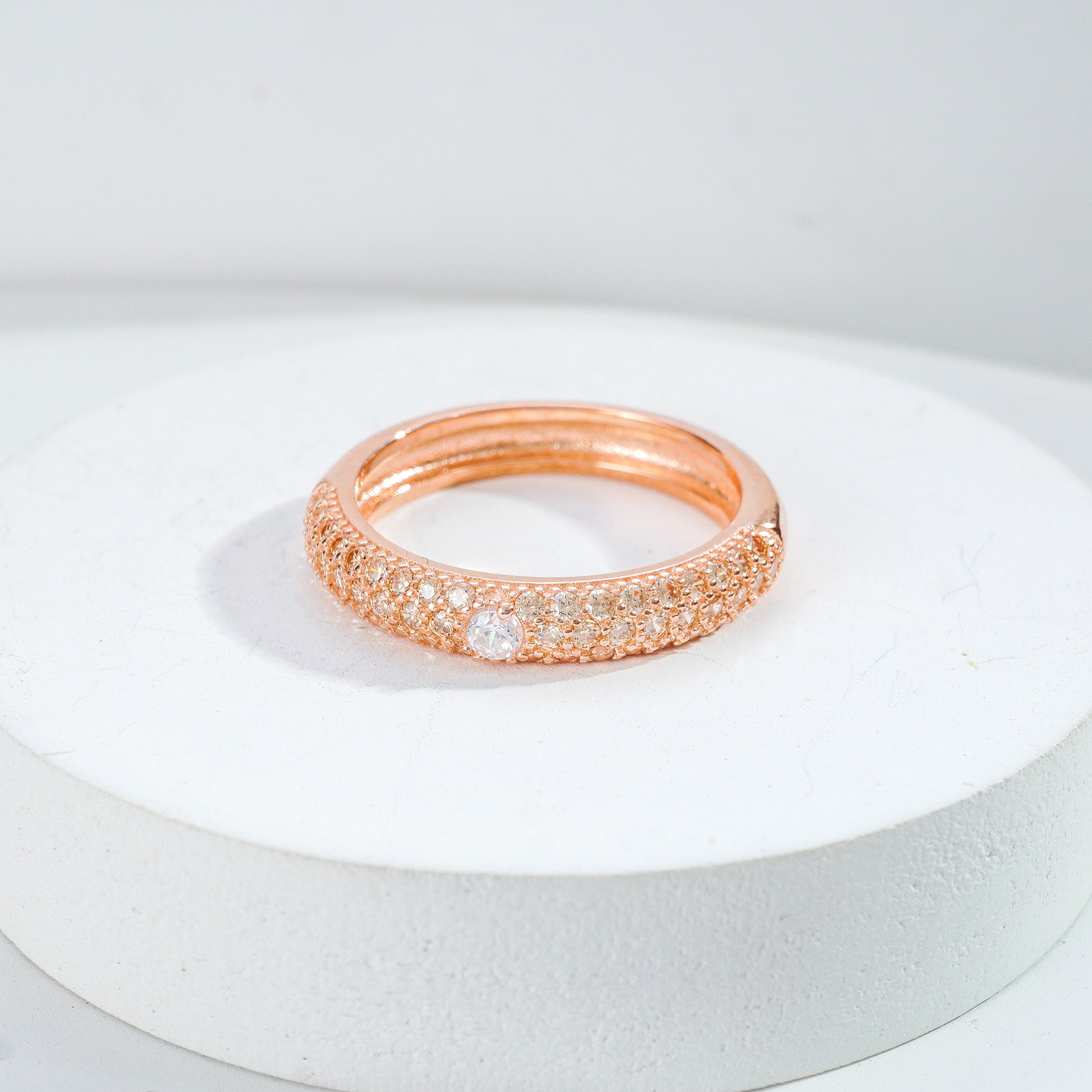 The Ember Pavé Band features a shimmering array of stones set in a warm, textured band, evoking a sense of refined warmth and radiance.