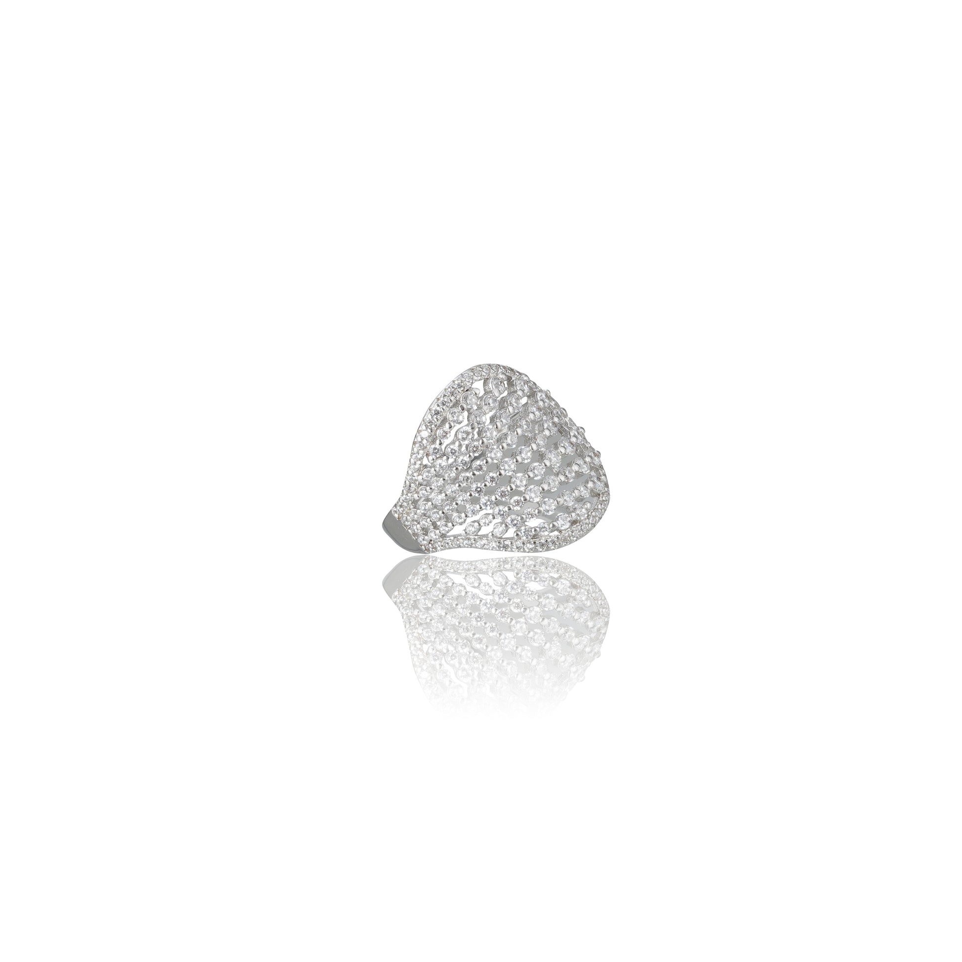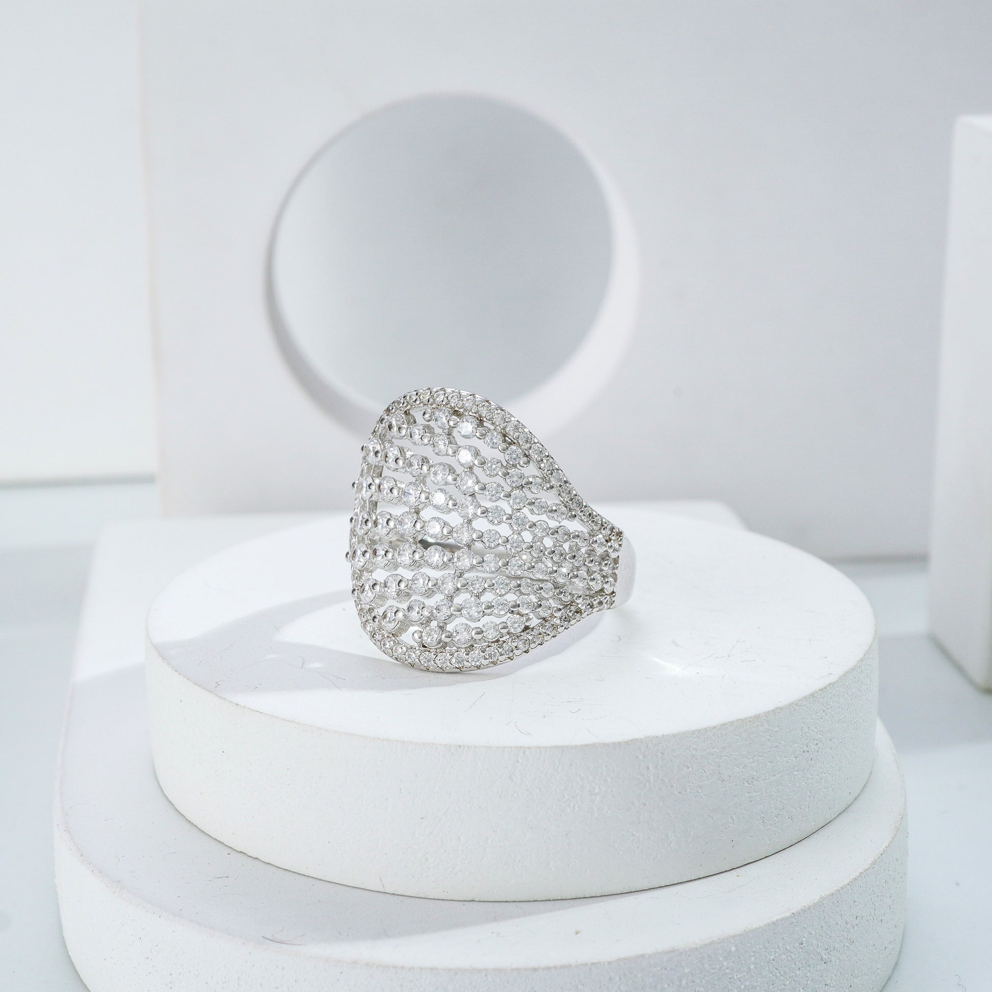 The Cascade Mesh Ring features a delicate wave pattern of interwoven silver strands, each adorned with shimmering stones, creating a fluid and dynamic design.