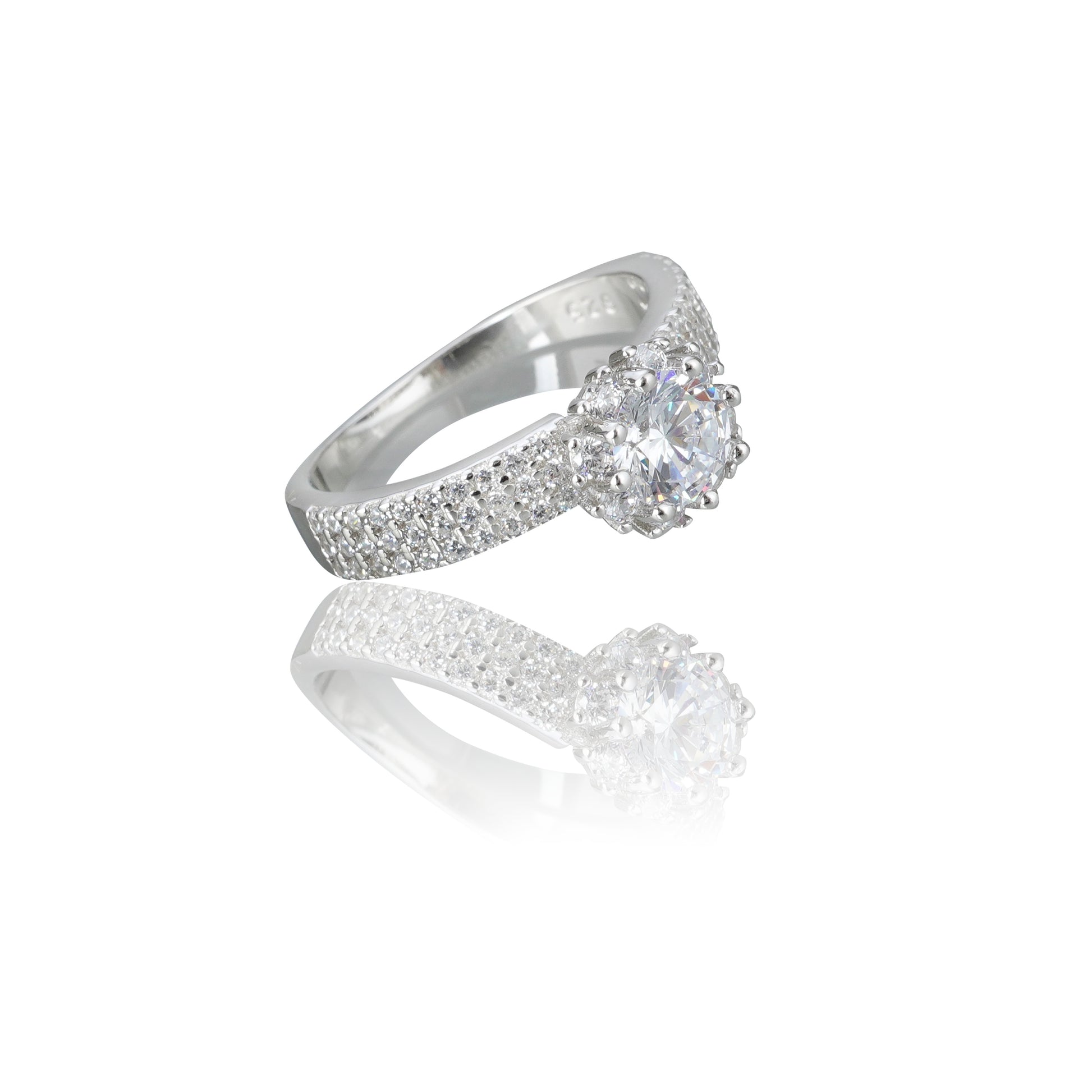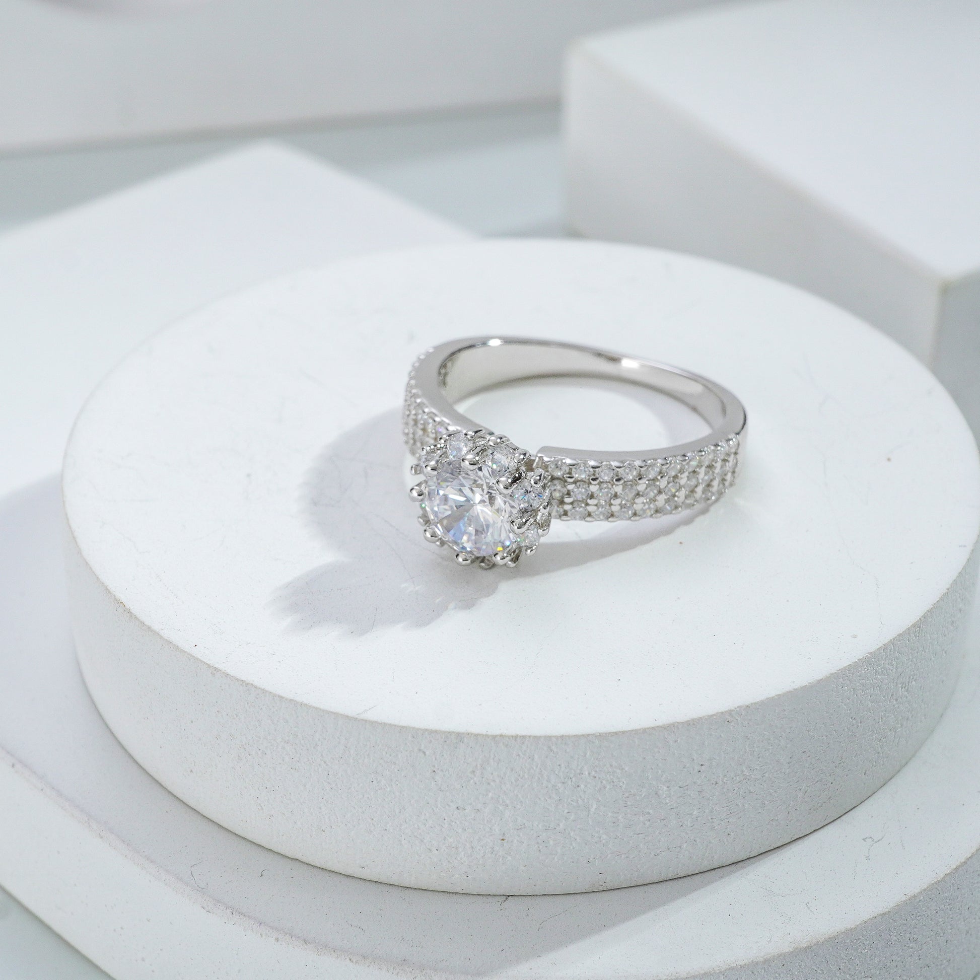 The Lustrous Crown Ring features a central round diamond encircled by smaller diamonds, set on a band encrusted with pavé diamonds for a refined and striking look.