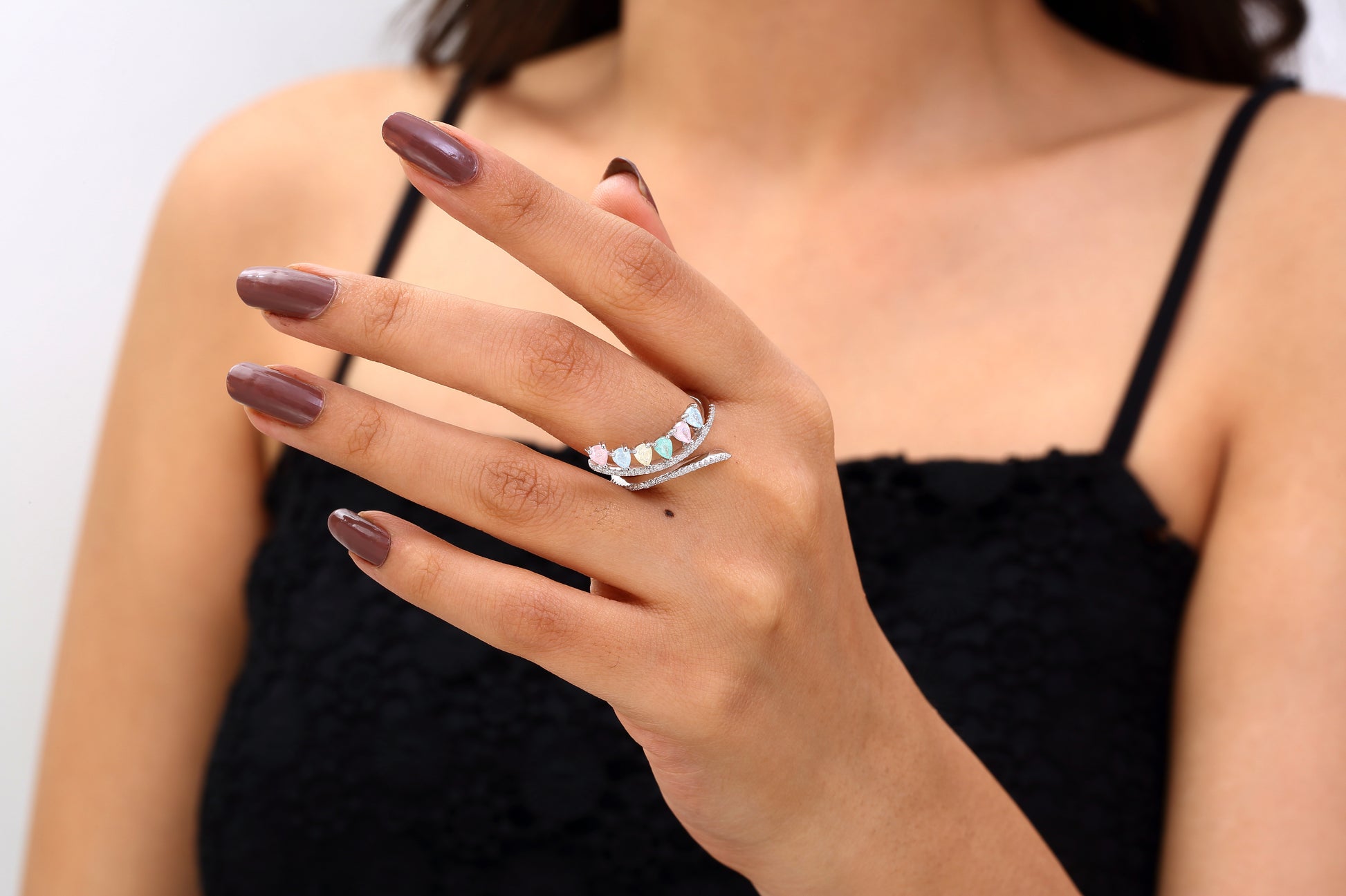 The Pastel Wave Ring features a graceful curve of pastel-colored gemstones, set along a sleek, diamond-accented band for a touch of modern elegance.