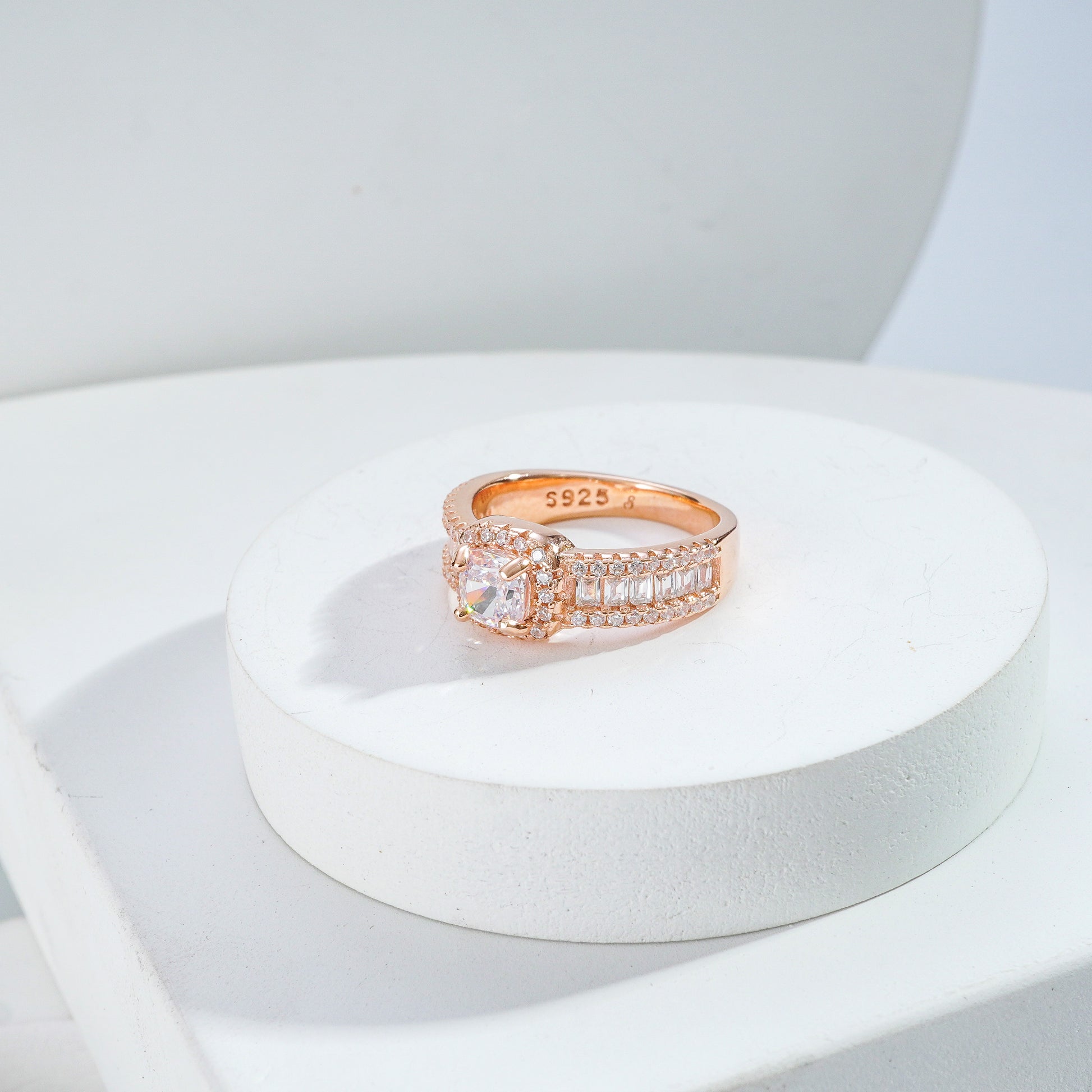 The Regal Cascade Ring features a central gem surrounded by cascading rows of baguette and pavé stones, creating a design that exudes opulence and refined elegance.